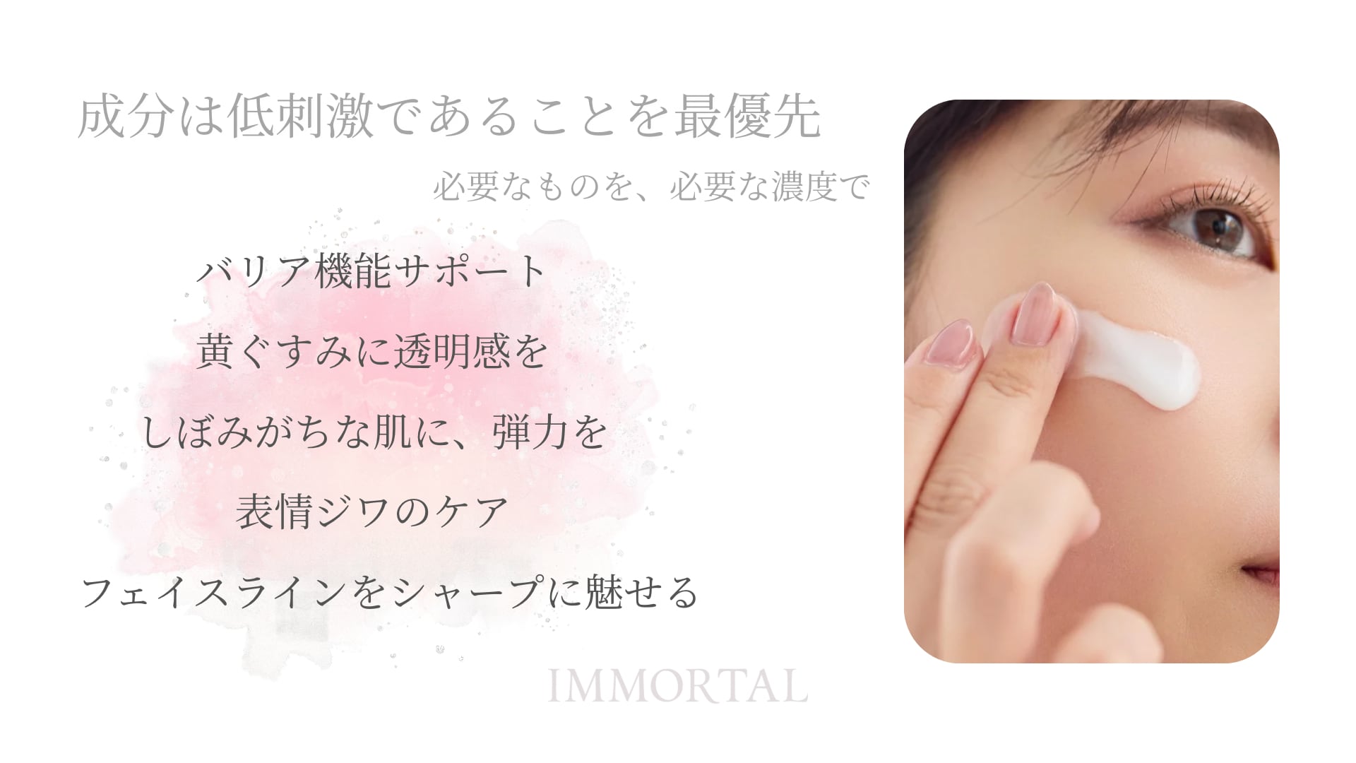 IMMORTALは、“敏感肌でも痛みゼロで美容医療級”を目指すスキンケアブランドです。 忙しい日々のなかで、深呼吸すら忘れてしまうときがある。 誰かの言葉に傷ついたまま、立ち止まってしまう夜もある。 そんな時間の中でも、スキンケアのその一瞬が、「自分を否定しない時間」になってほしい。 このプランでは、ブランド誕生を記念した「お礼カード」をお届けします。 写真とメッセージを添えたその1枚が、日々の中でふと目に留まり、心をそっと癒す存在になれば嬉しいです。 このプランのご支援金は、美容液の初回製造費や資材費など、IMMORTALの活動継続に必要な費用へ大切に充てさせていただきます。